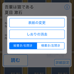 詳細設定では表紙の変更・しおりの消去・文字方向の切りかえができます。
