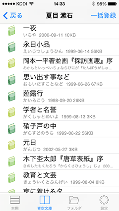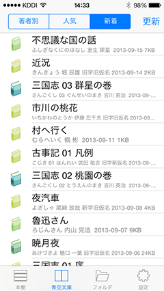 続々と増える新着書籍にも対応青空文庫の書籍は有志の方々の尽力により次々と新着書籍が公開されています。i文庫Sではこの新着書籍も随時ダウンロードできます。 |