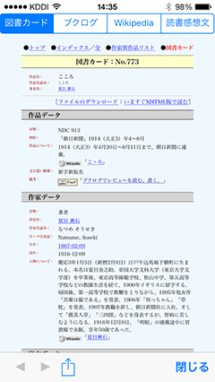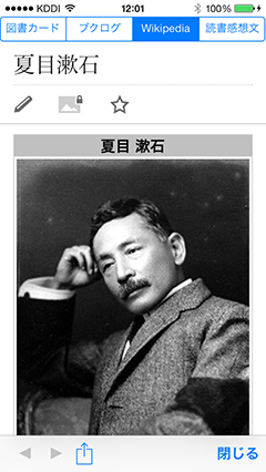 図書カード・読書感想文・Wikipedia表示青空文庫作品に関する様々な情報を簡単に閲覧できます。「図書カード」は青空文庫サイト内にある作品ごとのページで、詳細な情報を得ることができます。 読書感想文の投稿・閲覧でもできます。 作品に対する感想などを気軽に書きこんでみてください。 作家のWikipediaページも検索の手間をかけずに表示します。 Wikipediaページは青空文庫の作品以外でも利用することができます。 |