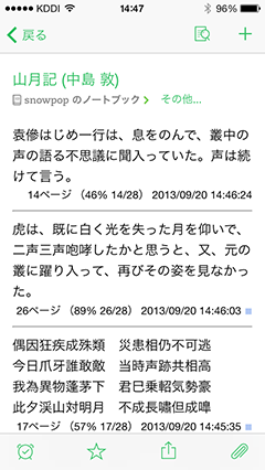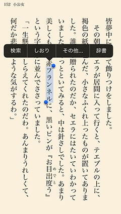 気になる単語を調べる、発見を記録する内蔵の辞書やYahoo!辞書・Wikipediaなどを活用して、単語の意味を調べる事ができます。作品中で気になった言葉や自分の思ったことなどをメモしておくこともできます。 メモはしおりに書きこむかたちで保存され、しおり同様何枚でも書き込めます。 しおりとメモの内容はEvernoteに転送が可能です。 |